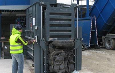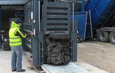Das Modell HSM HL 3521 T kann z. B. über ein Förderband beschickt werden und ist speziell für die Verpressung von Reifen konzipiert. Selbstverständlich können alle anderen Verpackungsmaterialien ebenfalls verpresst werden.